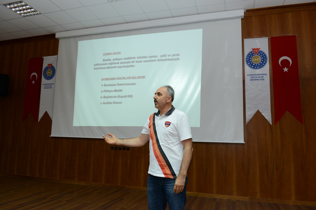 KSÜ Avşar Yerleşkesi, Senem Ayşe Konferans Salonunda gerçekleşen eğitime çok sayıda özel güvenlik personeli katıldı. İl Emniyet Müdürlüğü Olay Yeri İnceleme ve Kimlik Tespit Şube Müdürlüğü, Bomba İmha ve İnceleme Büro Amirliği, Bomba Uzmanı Nihat Çetin ve KSÜ Güvenlik Amiri Nedim Duman tarafından özel güvenlik personeline bomba ve şüpheli paket konularında eğitim verildi.