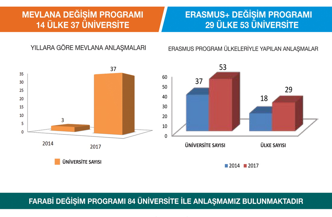 Akademik alandaki gelişmelerin ve altyapı çalışmalarının tamamlanmasıyla birlikte son 3 yılda öğrenci sayısında önemli bir artış olduğunu dile getiren Rektör Deveci, 2014 yılı sonunda 27 bin olan öğrenci sayısının 2017 yılında 42 bin 38’e ulaştığını söyledi. Üniversitemizin uluslararası düzeyde tercih edilme oranının önemli bir artış gösterdiğini kaydeden Rektör Deveci, “2014 yılında üniversitemizde 223 yabancı öğrenci eğitim görürken, 2017 yılında 41 ülkeden 1710 öğrenciye eğitim veriyoruz. Bunun yanı sıra öğrenci değişim anlaşmalarında da önemli bir seviyeye ulaştık. Üniversitemizin Erasmus+ Öğrenci Programı kapsamında 29 ülkeden 53 üniversite ile anlaşması bulunuyor. Ayrıca üniversitemizin Mevlana Değişim Programı kapsamında 14 ülkeden 37 üniversiteyle anlaşması var. Yurtiçinde ise Farabi Değişim Programı kapsamında 84 üniversite ile anlaşma yapıldı.” şeklinde konuştu.