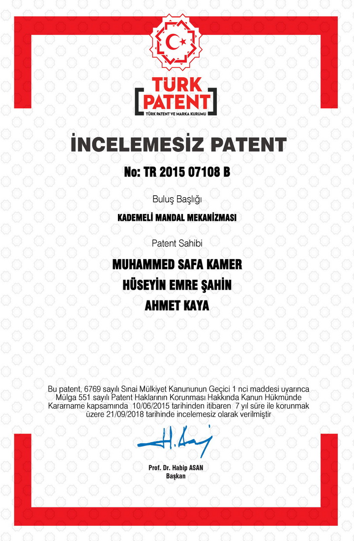 Kahramanmaraş Sütçü İmam Üniversitesi Mühendislik ve Mimarlık Fakültesi Makine Mühendisliği Bölümü öğretim elemanları Prof. Dr. Ahmet Kaya, Öğr. Gör. Muhammed Safa Kamer, Arş. Gör. Hüseyin Emre Şahin tarafından geliştirilen ve 2015 yılında patent başvurusu yapılan “Kademeli Mandal Mekanizması”, Türk Patent ve Marka Kurumu tarafından 21.09.2018 tarihinde İncelemesiz Patent olarak tescillenmiştir.