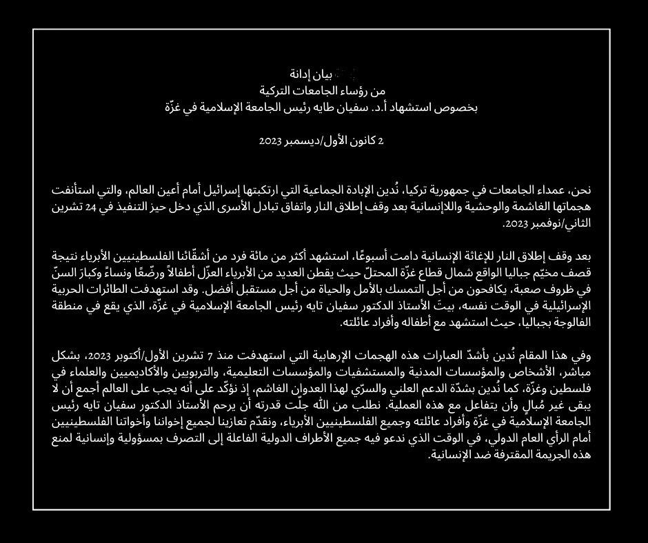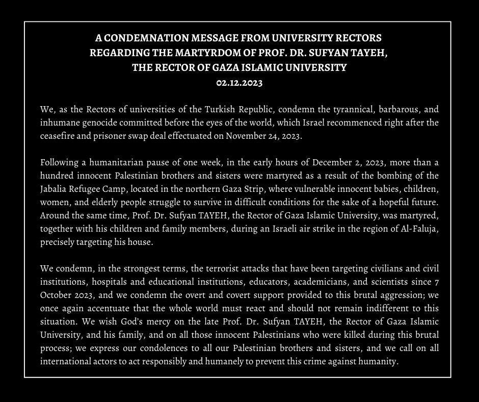 Üniversite Rektörlerinden Gazze İslam Üniversitesi Rektörü Prof. Dr. Sufyan TAYEH'in Şehit Edilmesiyle İlgili Kınama Mesajı
